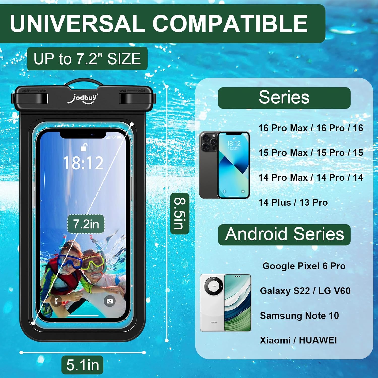 IPX8 Waterproof: The jodbuy waterproof phone pouch offers maximum protection up to a depth of 30 meters (100 feet), ensuring full sealing to protect your phone during water sports. It keeps out water, snow, dust, sand, and dirt.