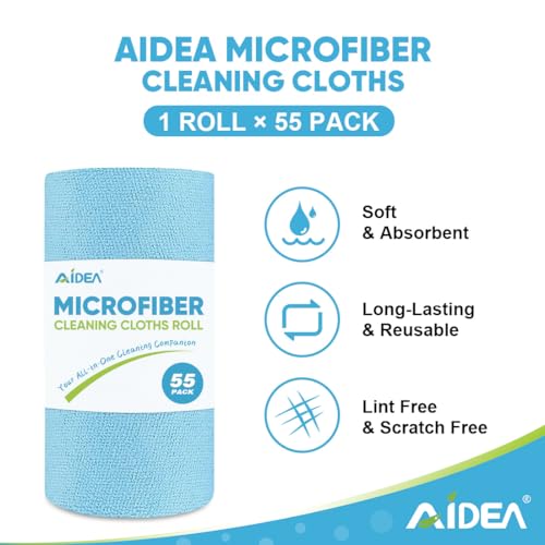 AIDEA Blue Shop Towels 55PK(1 Roll), All-Purpose Microfiber Blue Shop Towels, Lint-Free Cleaning Rags Microfiber Cloth, Reusable Paper Towels for Automotive, Mechanic, Workshops, House, Kitchen-11×9″