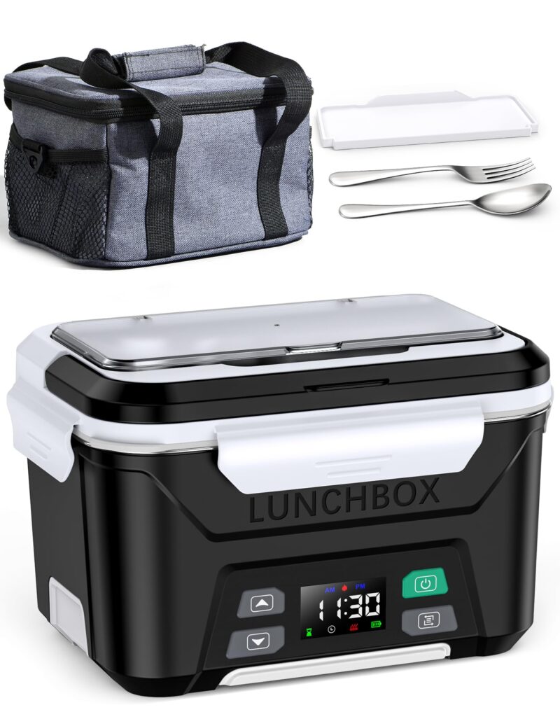 - Smart Timer Function: The heated lunch box for men includes a smart timer for setting your mealtime. It automatically heats your food in advance, ensuring a hot meal when you’re ready. The memory function remembers your last settings, so no adjustments are needed each time