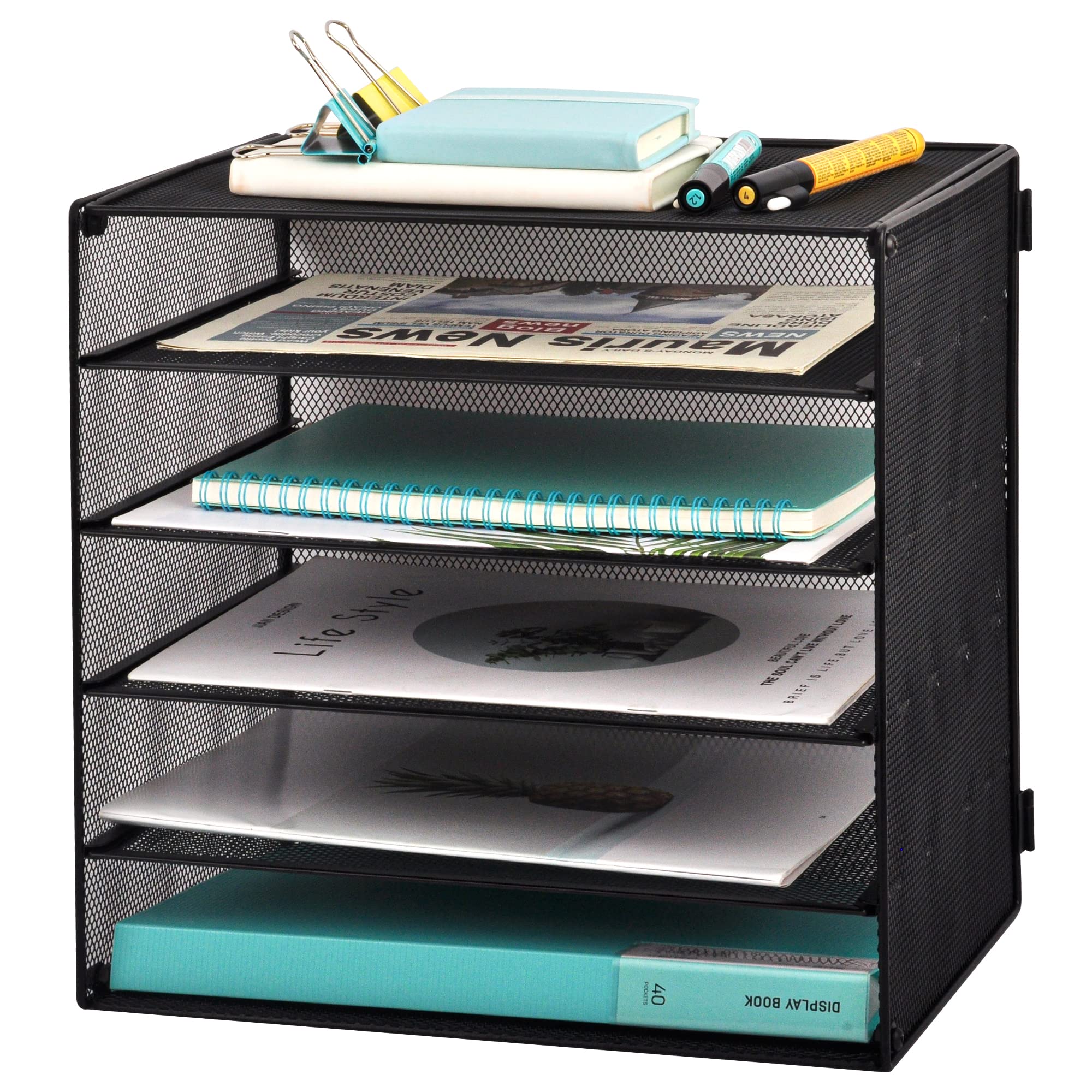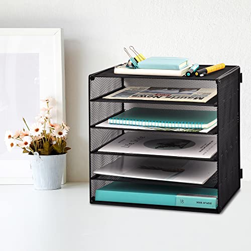 EASEPRES 5 Slot Wire Desk File Organizer Tray, Mesh Filling Paper Letter Tray Metal Desktop Paper Sorter Literature Organizer Rack for Home Office School, Black