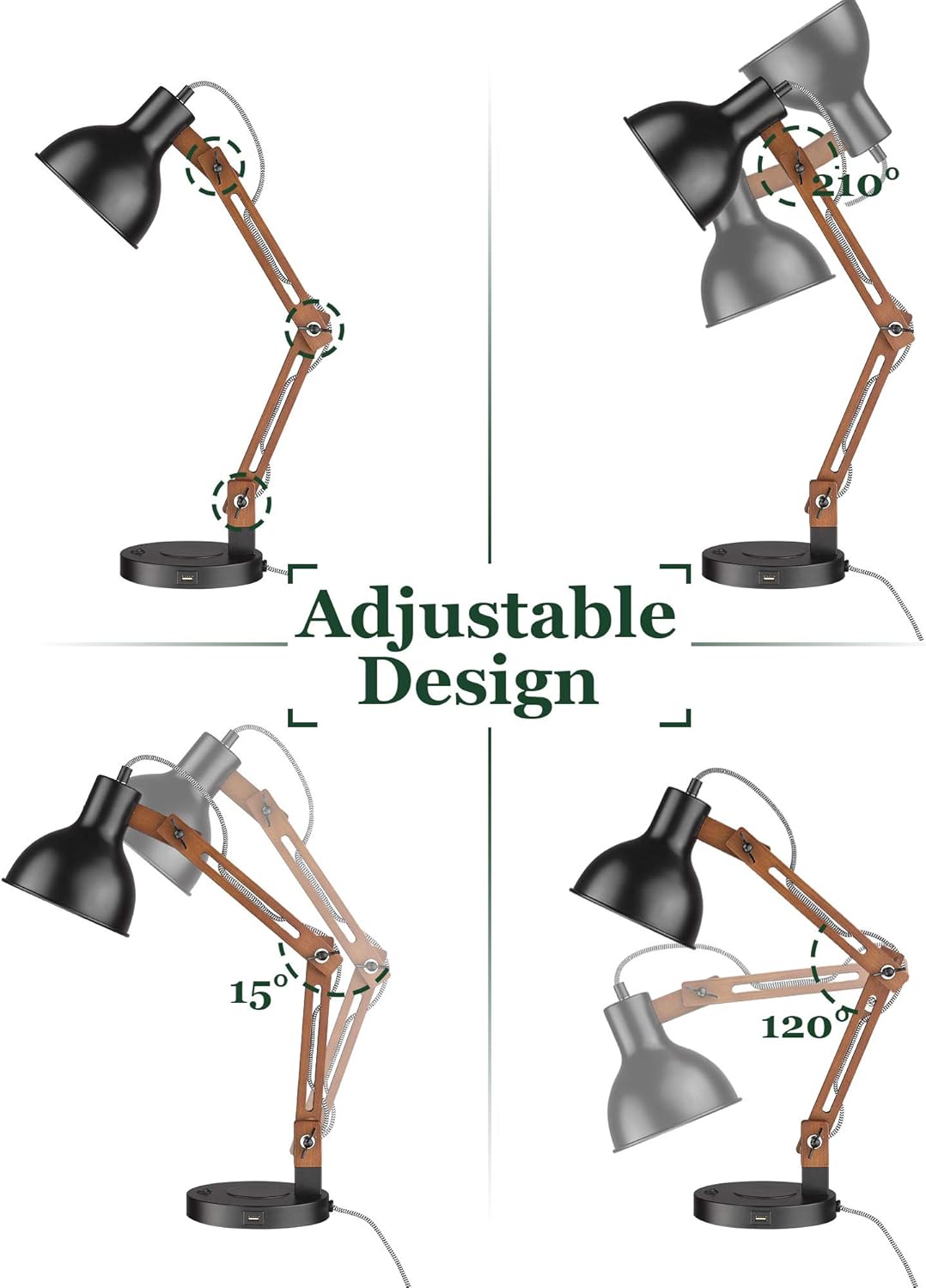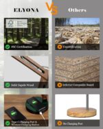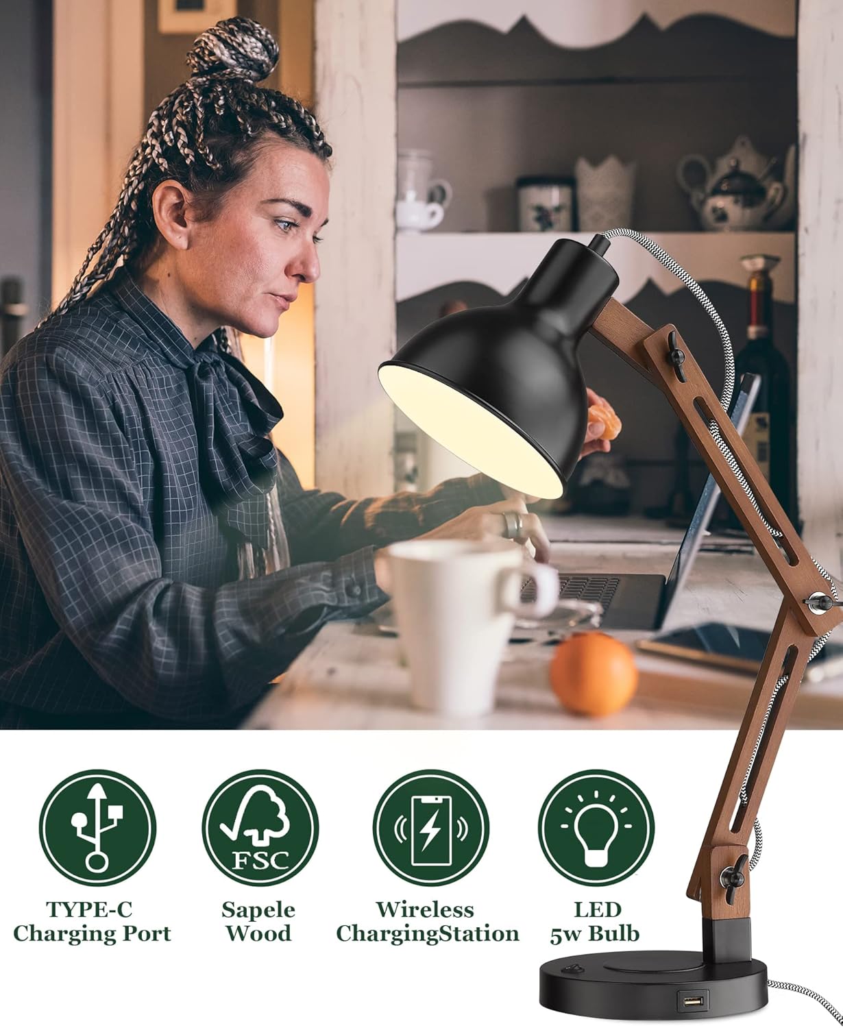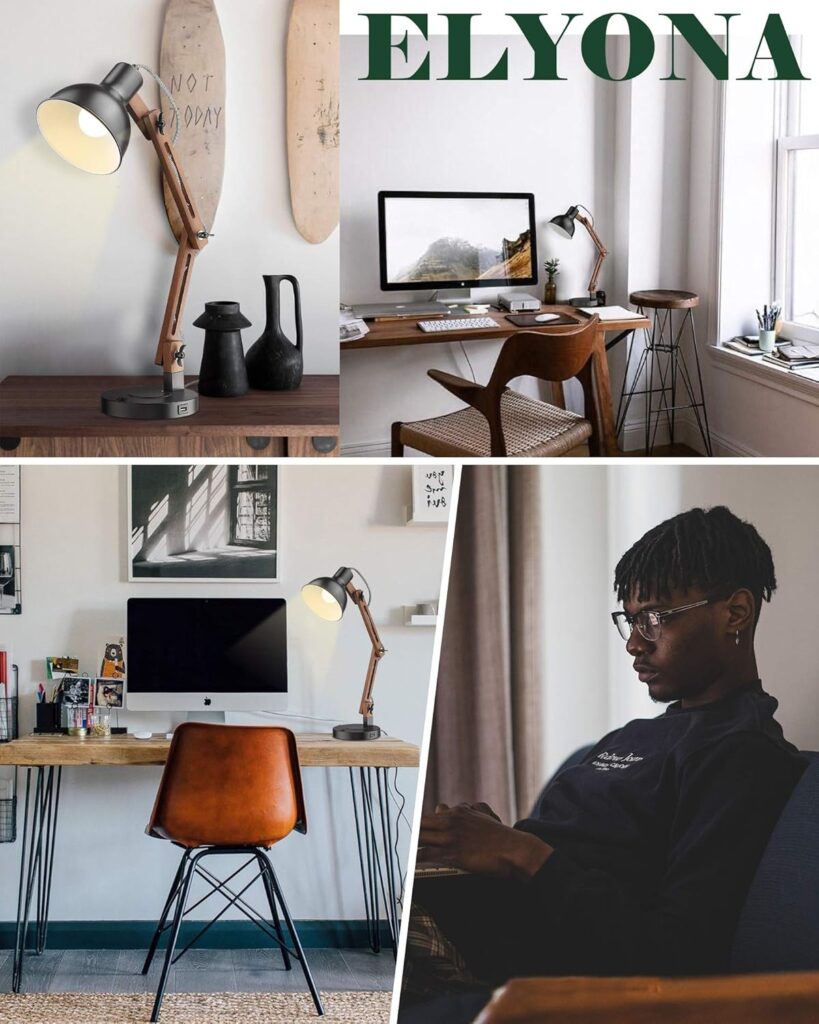 ELYONA Modern LED Desk Lamp with Upgraded Wireless Charger & USB C Charging Port Sapele Wood Table Lamp Swing Arm Bedside Reading Task Light for Dorm Office Bedroom Living Room Bulb Included Black