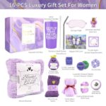 - 16-PCS Luxurious Gift Set:Each set includes: 1*20 OZ Vacuum Insulated Tumbler,1*3.5 OZ Lavender Scented Candle,1*Lavender Bath Ball,1*Diamond Handmade Bath Soap,1*Lavender Scented Bath Salt,1*Lavender Shower tablets,1*Lemon Shower tablets,1*Coral Velvet Bear Towel,1*Purple Agate Stretch Rope Bracelet,1*Silk Eye Mask,1*Scrunchies,1*59×39 inch Flannel Blanket,1*Plush Fuzzy Socks,1*Handmade Crochet Gifts ,1*Elegant Gift Card,1*Exquisite Gift Box