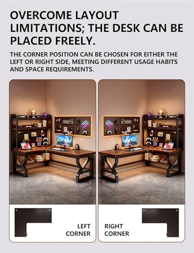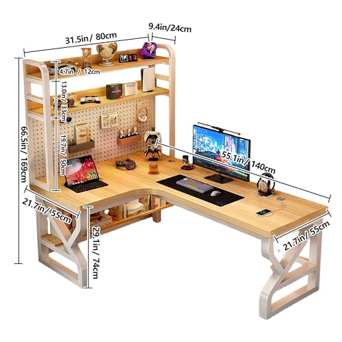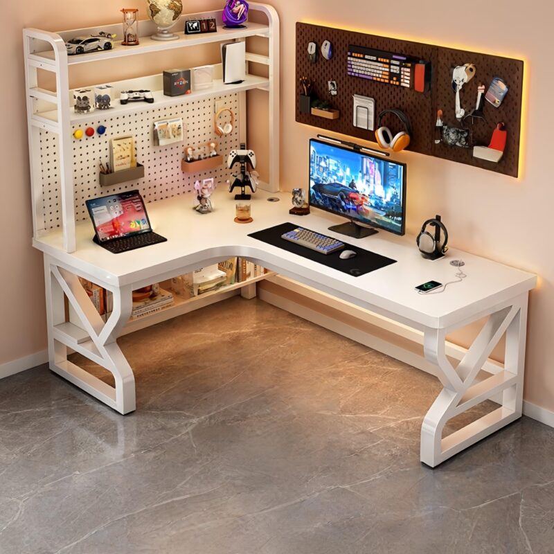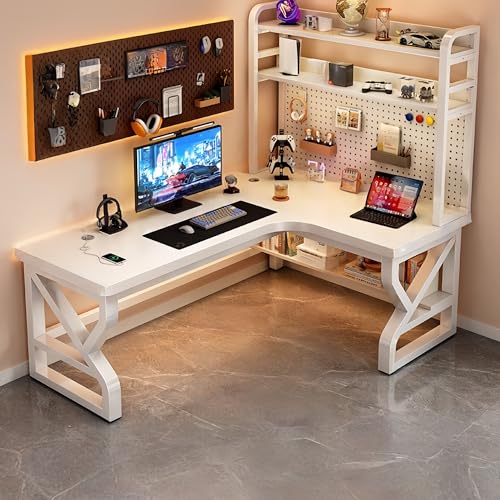 L Shaped Desk with Hutch and DIY Pegboard, Modern Corner Writing Table with USB Charging Station, Space-Saving Study Workstation for Bedroom Student, 25mm Thickened Desktop(White,Right,47.2in)