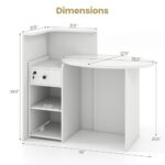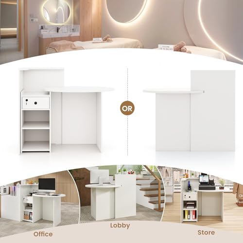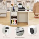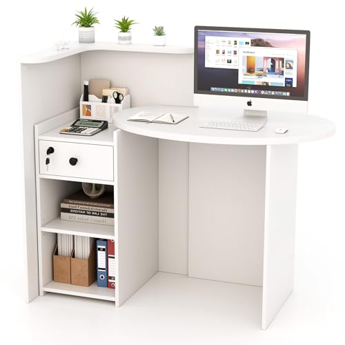 7 reviews for L Shaped Reception Desk, Small Retail Checkout Counter with Lockable Drawer and Open Shelves, Wooden Oval Desktop, Front Desk Reception Counter for Store Office Lobby Salon (White)