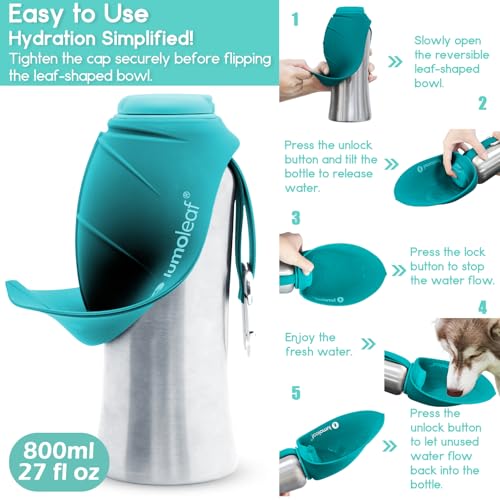 LumoLeaf Portable Dog Water Bottle 800 ml, Stainless Steel Pet Travel Water Bottle Dispenser for Walking, Hiking and Outdoor, Portable Water Bowl for Large Dogs (Blue)