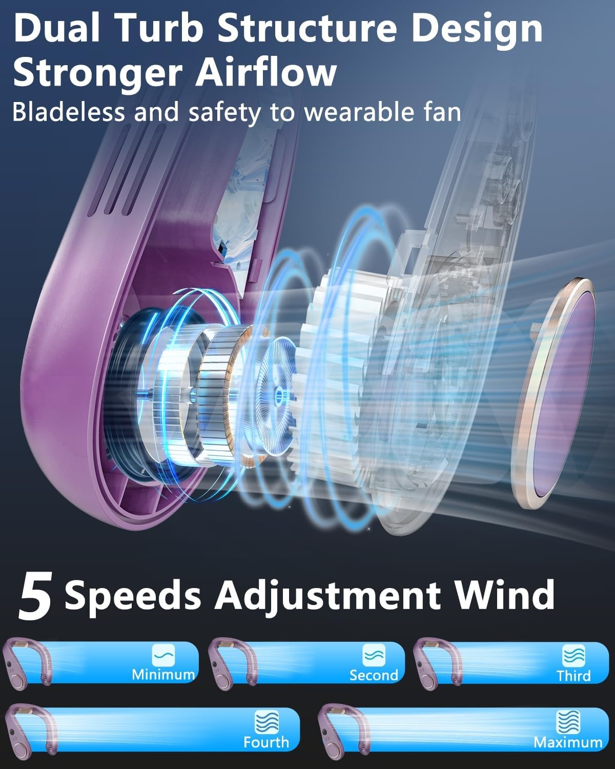 Cooling neck fan stands out for its powerful motor equipped with dual turbines, offering a combination of enhanced cooling performance and reduced noise levels.