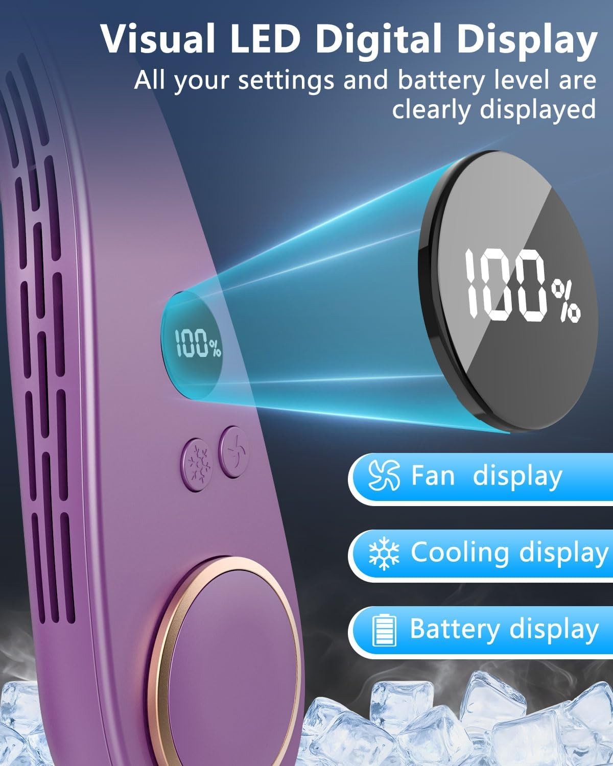 - A neck fan with a cooling function and a display screen is an excellent personal cooling device. Real-time display information provides you with valuable feedback,you can monitor and adjust the fan’s settings according to your preferences.