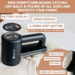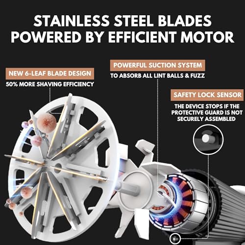 - 【EFFICIENT AND EASY TO USE】The 6-leaf stainless-steel blade is 50% quicker at removing fuzz than traditional blades. The large shaving panel and ergonomic handle make it easier to cover large surfaces. The LED display indicates the battery power and current speed. This fabric pilling remover comes with a large capacity trash tank to collect lint during use.